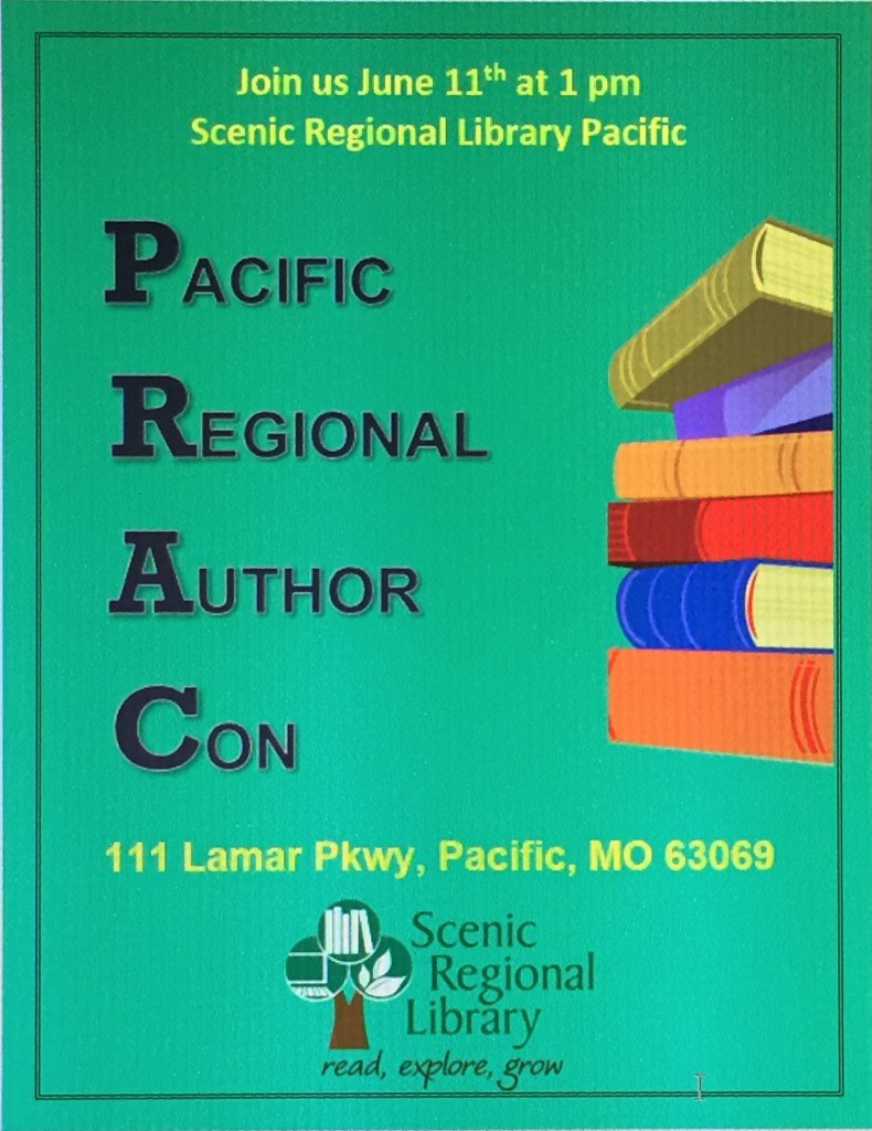 Curious about what makes a writer write? Well, mark your calendars and come join me and three other talented authors for the 1st annual Pacific Regional Author Con taking place Saturday June 11th starting at 1 pm in Pacific MO (see the flyer included). We’ll have books for sale featuring varied genres, plus a Q&A session where we’ll share tidbits about our books, our writing experiences, and our opinions. So bring a friend and plenty of questions because we love to talk about our craft. See you there.