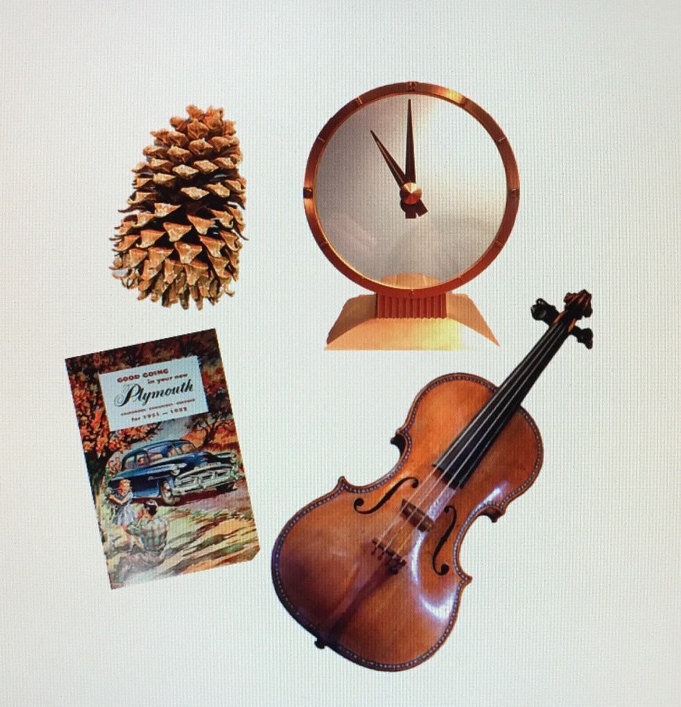 This week’s blog features another four-prompt short story minus my four-prompt private eyes. The items to challenge me this time were: A 1952 Plymouth owner’s manual A huge pine cone A Jefferson Electric ‘Golden Hour’ desk clock An aged violin Scanning the above items in search of a story line, a fictionalized version of some… Continue reading Boxes of Memories